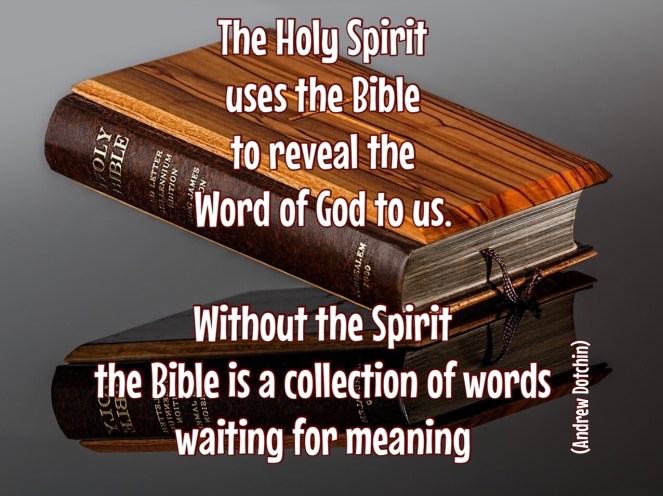 Secondly, and please listen carefully, the Bible, by itself, is not the whole word of God. Jesus is the Word of God and it is to Him, under the gentle guidance of the Holy Spirit, that the Bible points as the author of salvation. When we forget this and become obsessed with the words of the text we neglect to listen for the whispers and nudgings of the Holy Spirit and find ourselves worshipping the Bible instead of Jesus. This is immensely saddening as it means that, or all the good things it contains within its pages, it becomes a dead letter. It is the work of the Holy Spirit to breathe life into the verses of the Bible and use them to reveal the Word of God to us. Without the Holy Spirit the Bible becomes a collection of words waiting for meaning.