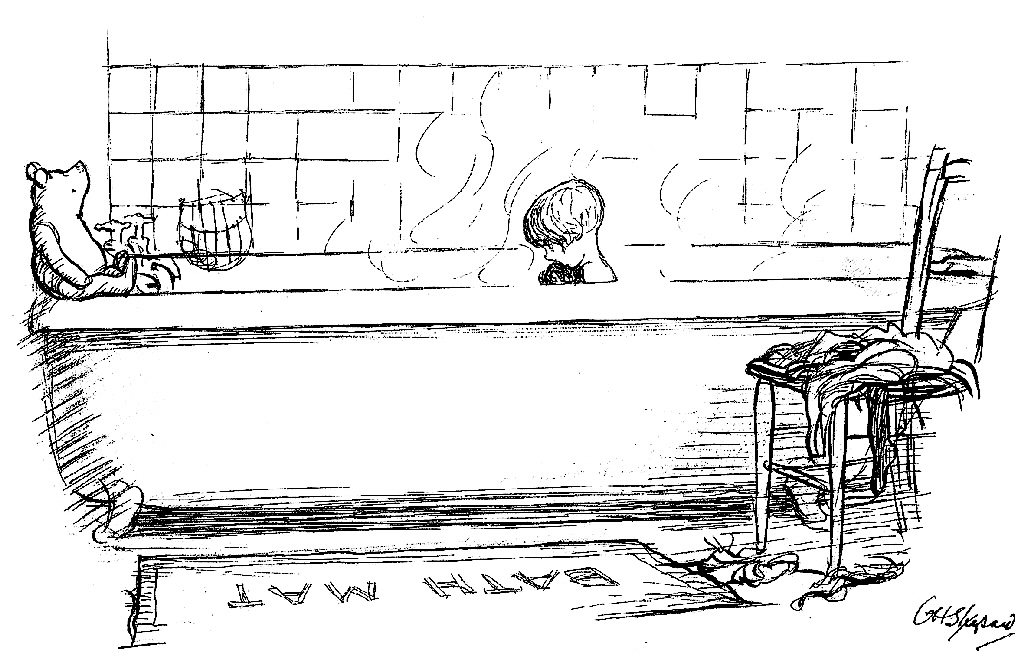 Christopher Robin gave a deep sigh, picked his Bear up by the leg, and walked off to the door, trailing Pooh behind him. At the door he turned and said, “Coming to see me have my bath?”