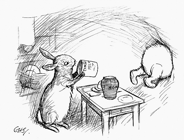 Pooh always liked a little something at eleven o’clock in the morning, and he was very glad to see Rabbit getting out the plates and mugs; and when Rabbit said, “Honey or condensed milk with your bread?” he was so excited that he said, “Both,” and then, so as not to seem greedy, he added, “But don’t bother about the bread, please.”