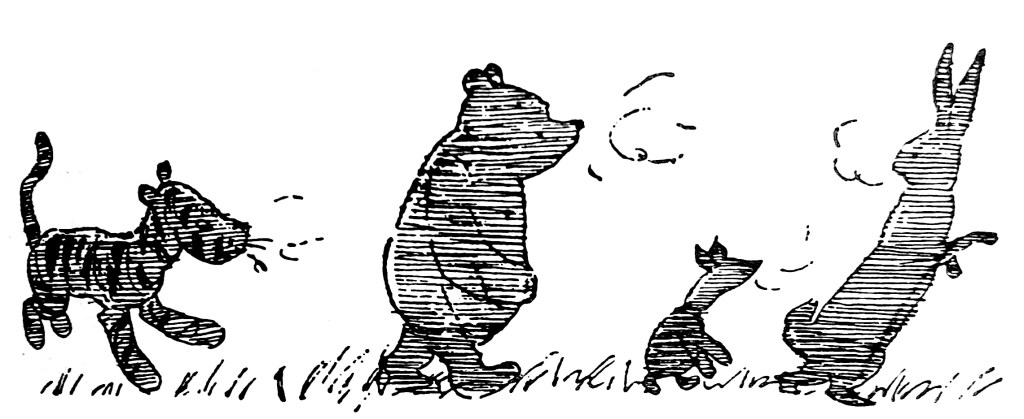 So they went. At first Pooh and Rabbit and Piglet walked together, and Tigger ran round them in circles, and then, when the path got narrower, Rabbit, Piglet and Pooh walked one after another, and Tigger ran round them in oblongs, and by-and-by, when the gorse got very prickly on each side of the path, Tigger ran up and down in front of them, and sometimes he bounced into Rabbit and sometimes he didn’t. And as they got higher, the mist got thicker, so that Tigger kept disappearing, and then when you thought he wasn’t there, there he was again, saying, “I say, come on,” and before you could say anything, there he wasn’t.