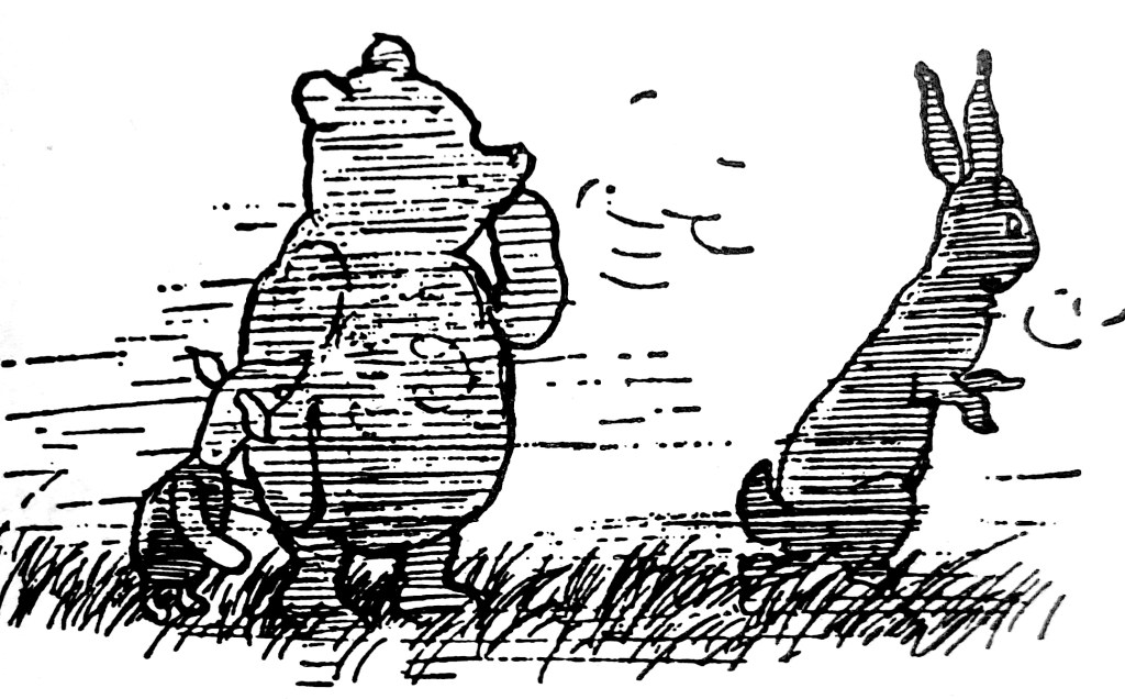 Poor, poor Rabbit, seeking to give Tigger a lesson and having him ‘unbounced’ he finds himself a victim of the ‘success’ of his own plot and hoist on a petard on his own making. For all of the ill-feeling we may have towards him about his seeking for vengeance perhaps now is the time, as Christopher Robin is so good at doing for Pooh, to look upon him, shake our heads and say, ‘Silly old Rabbit’.