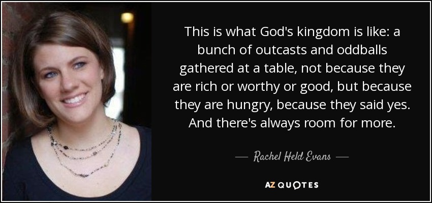 This is what God’s kingdom is like. A bunch of outcasts and oddballs gathered at a table, not because they are rich or worthy or good but because they are hungry, because they said yes. And there’s always room for more. (Rachel Held-Evans)