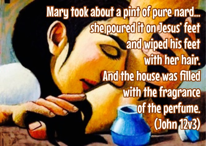 Text: Mary took about a pint of pure nard, an expensive perfume; she poured it on Jesus’ feet and wiped his feet with her hair. And the house was filled with the fragrance of the perfume. (John 12v3)