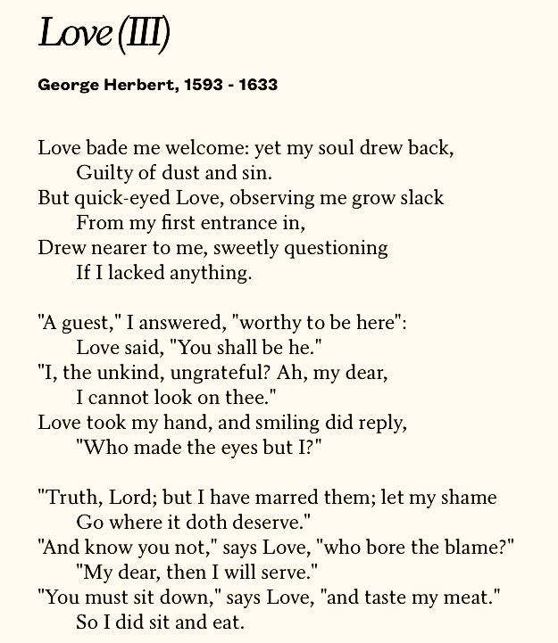 Print out the words to George Herbert’s ‘Love Bade me Welcome’ and keep it in your Bible, Prayer Book or Journal to turn to every time you feel a little unworthy of the love of the One Who Loves us Best