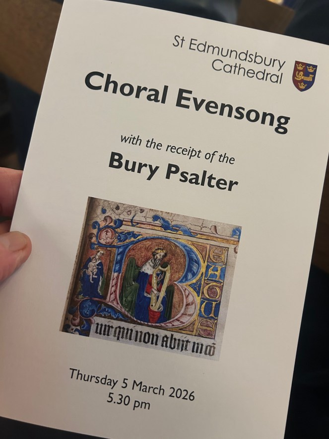 But it is not only the contemporary worship scene that faces this challenge of heaping up empty phrases (Matthew 6v7). This week I attended a glorious Choral Evensong at St Edmundsbury Cathedral in which the Bury Psalter, written and illuminated by the Benedictine monks who used to live and pray in the ruins that surround our cathedral, was given into the safekeeping of the Cathedral and Chapter. The Vicars Choral led much of the service in Latin Plainsong using the very words from the Psalter and I felt as if heaven was within touching distance. Yet, knowing me to be me, I recognise that a diet of pure Latin Chant would not be healthy eating. I would too easily be caught up in the beauty of the words and the harmony of music and soon forget to worship…