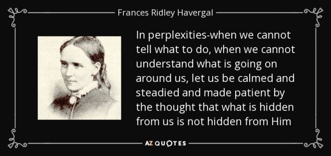 ‘I went for a little visit of five days. There were ten persons in the house, some unconverted and long prayed for; some converted, but not rejoicing Christians. He gave me the prayer: “Lord, give me all in this house.” And He just DID! Before I left the house everyone had got a blessing. The last night of my visit, after I had retired, the governess asked me to go to the two daughters. They were crying, etc. Then and there both of them trusted and rejoiced. It was nearly midnight. I was too happy to sleep, and passed most of the night in praise and renewal of my own consecration; and these little couplets formed themselves and chimed in my heart one after another till they finished with “ever, only, all for Thee”’